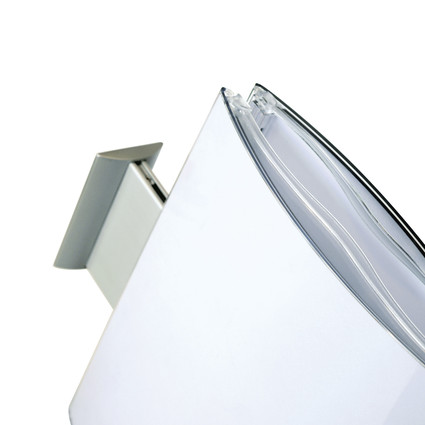 Das doppelseitige Fahnenschild der pixquick Beschilderungsserie überzeugt mit allen Vorteilen der cleveren Info-Display-Reihe Pixquick: Die Information wird einfach ausgedruckt und kann jederzeit schnell ausgetauscht werden. Erhältlich ist das gewölbte Windschild pixquick Flag in vielen Formaten. Der hochwertige Wandhalter aus silbermattem Metalldruckguss hält das Fahnenschild sicher an der Wand. Pixquick - ihre Wahl für ein durchgängig gestaltetes und flexibles Wegeleitsystem für Bürogebäude, Hotels oder öffentliche Einrichtungen wie Krankenhäuser.